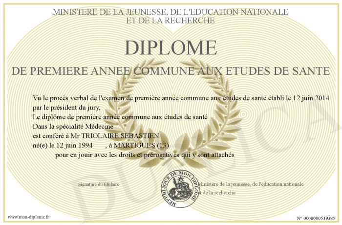 Envoyez par email votre Diplôme de première année commune aux études de santé personalisé