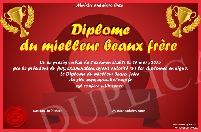 Envoyez par email votre Diplôme du mielleur beaux frère personalisé