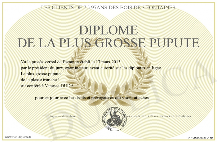 Envoyez par email votre Diplome de la plus grosse pupute personalisé