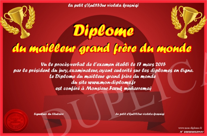 Envoyez par email votre Diplôme du mailleur grand frère du monde personalisé