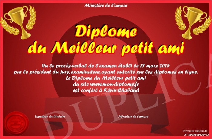 Envoyez par email votre Diplôme du Meilleur petit ami personalisé