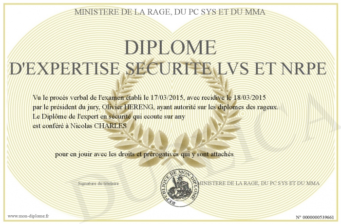 Envoyez par email votre Diplôme d'expertise sécurité LVS et NRPE personalisé