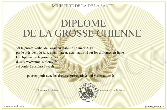 Envoyez par email votre Diplôme de la grosse chienne personalisé