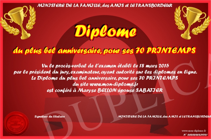 Envoyez par email votre Diplôme du plus bel anniversaire, pour ses 70 PRINTEMPS personalisé