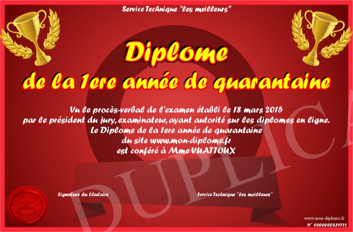 Envoyez par email votre Diplôme de la 1ere année de quarantaine personalisé