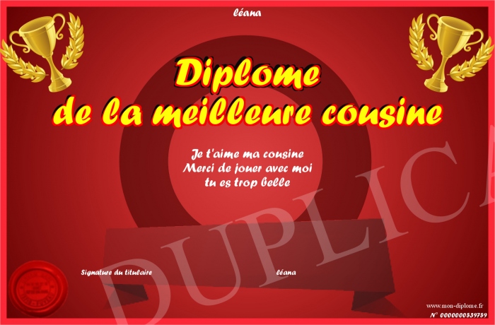 Envoyez par email votre Diplôme de la meilleure cousine personalisé