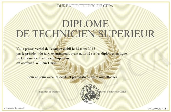 Envoyez par email votre Diplôme de Technicien Supérieur personalisé