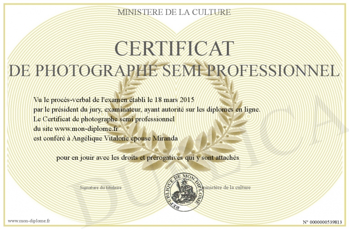 Envoyez par email votre Certificat de photographe semi professionnel personalisé