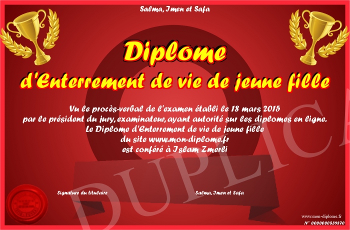 Envoyez par email votre Diplome d'Enterrement de vie de jeune fille personalisé