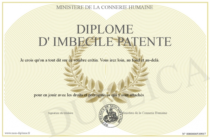 Envoyez par email votre Diplôme d' Imbécile Patenté personalisé