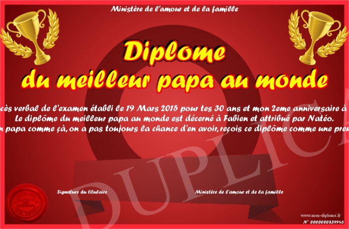 Envoyez par email votre Diplôme du meilleur papa au monde personalisé