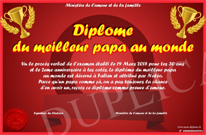 Envoyez par email votre Diplôme du meilleur papa au monde personalisé