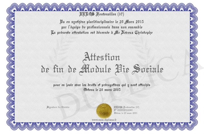Envoyez par email votre Attestion de fin de Module Vie Sociale personalisé