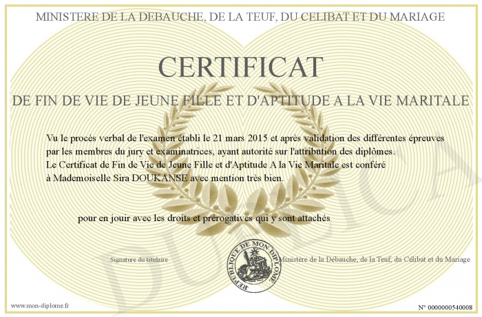 Envoyez par email votre certificat de fin de vie de jeune fille et d'aptitude a la vie maritale personalisé