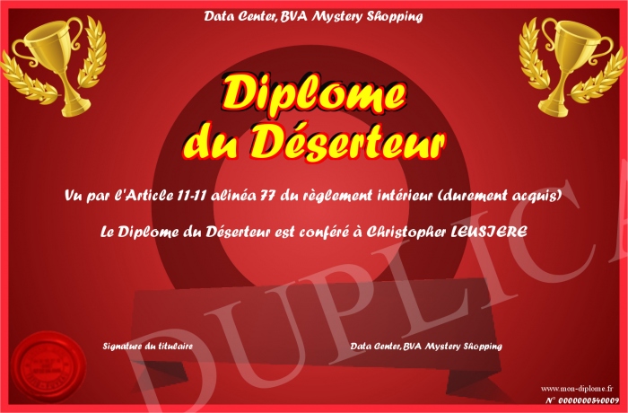 Envoyez par email votre Diplôme du Déserteur personalisé