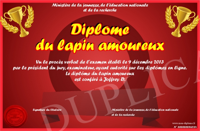 Envoyez par email votre Diplôme du lapin amoureux personalisé
