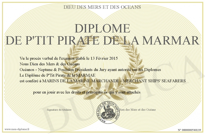 Envoyez par email votre Diplôme de P'Tit Pirate de la MARMAR personalisé