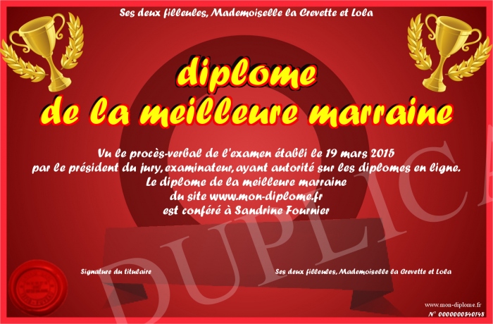Envoyez par email votre diplôme de la meilleure marraine personalisé