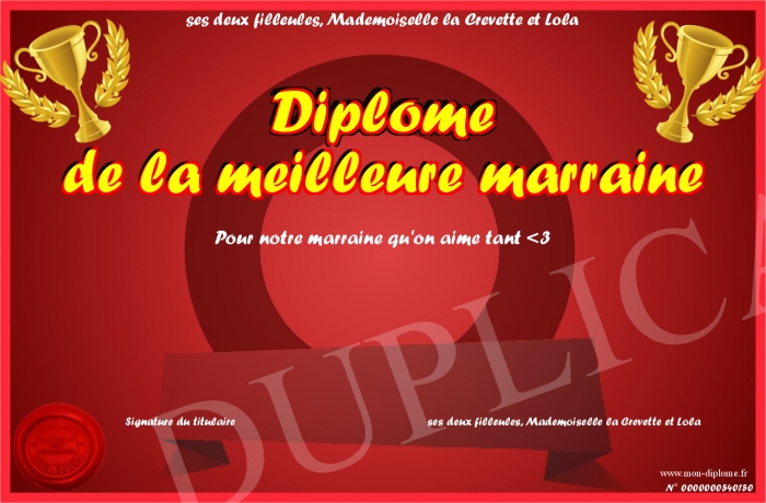 Envoyez par email votre Diplôme de la meilleure marraine personalisé