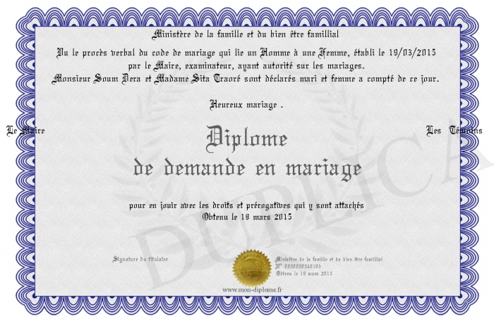 Envoyez par email votre Diplome de demande en mariage personalisé