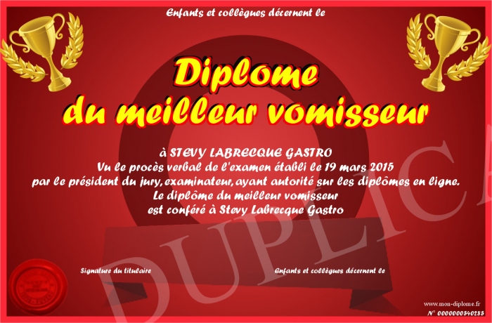 Envoyez par email votre Diplôme du meilleur vomisseur personalisé