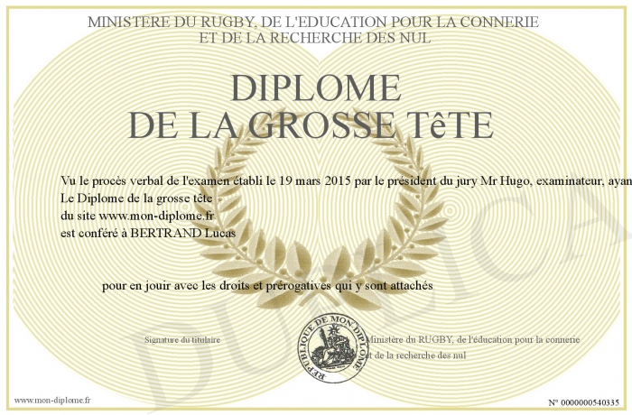 Envoyez par email votre Diplôme de la grosse tête personalisé