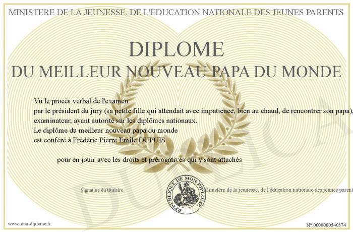 Envoyez par email votre Diplôme du meilleur nouveau Papa du monde personalisé