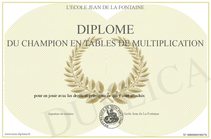 Envoyez par email votre Diplôme du champion en tables de multiplication personalisé