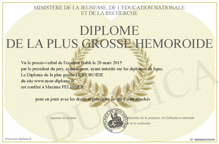 Envoyez par email votre Diplôme de la plus grosse HEMOROIDE personalisé