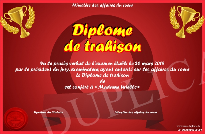 Envoyez par email votre Diplôme de trahison personalisé