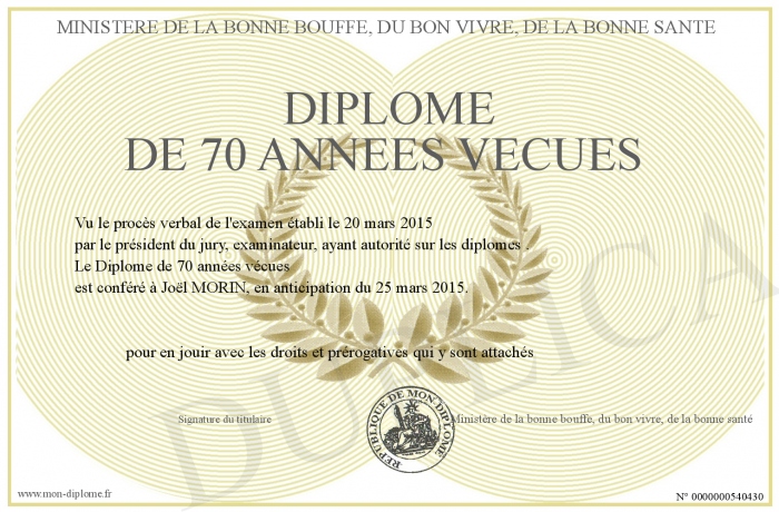 Envoyez par email votre Diplôme de 70 années vécues personalisé