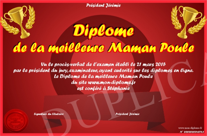Envoyez par email votre Diplome de la meilleure Maman Poule personalisé