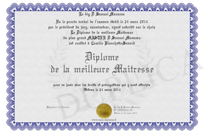Envoyez par email votre Diplome de la meilleure Maitresse personalisé