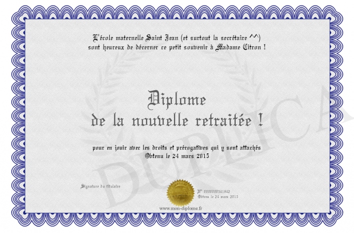 Envoyez par email votre Diplôme de la nouvelle retraitée ! personalisé