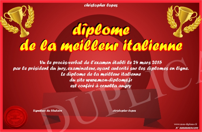 Envoyez par email votre dîplome de la meilleur italienne personalisé