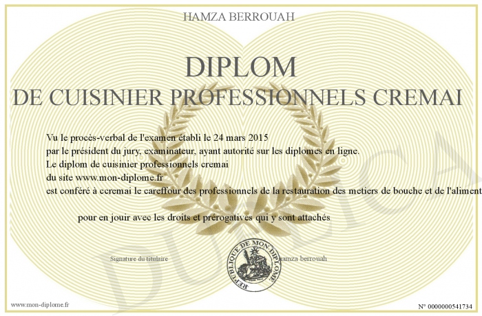 Envoyez par email votre diplom de cuisinier professionnels cremai personalisé