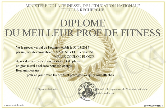Envoyez par email votre Diplôme du meilleur prof de fitness personalisé