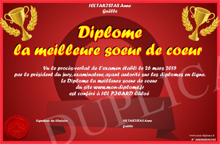 Envoyez par email votre Diplôme la meilleure soeur de coeur personalisé