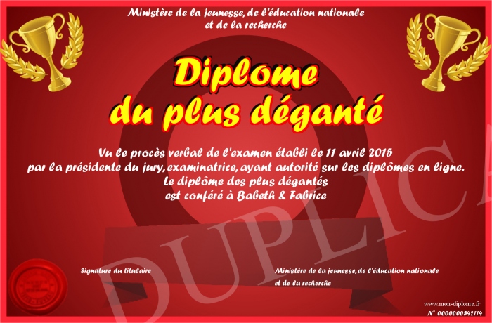 Envoyez par email votre Diplôme du plus déganté personalisé