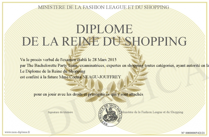 Envoyez par email votre Diplôme de la Reine du Shopping personalisé