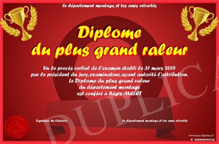 Envoyez par email votre Diplôme du plus grand raleur personalisé