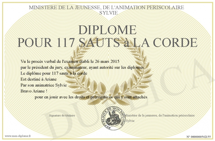 Envoyez par email votre Diplôme pour 117 sauts à la corde personalisé