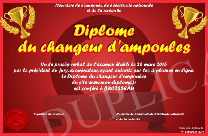 Envoyez par email votre Diplôme du changeur d'ampoules personalisé