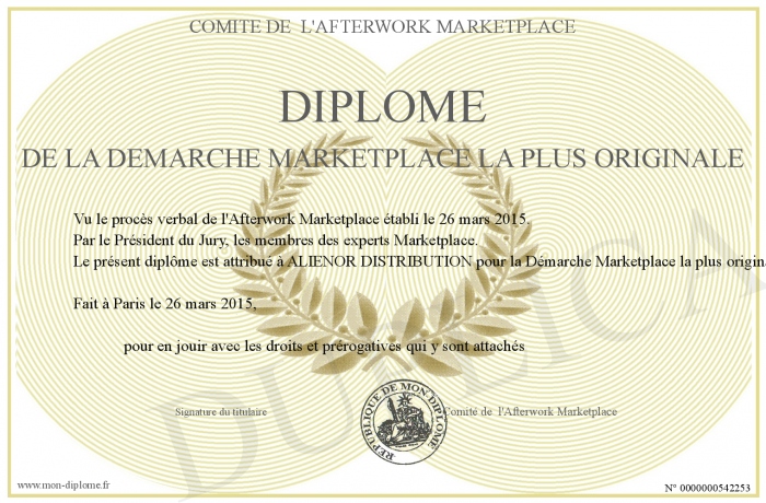 Envoyez par email votre Diplôme de la Démarche Marketplace la plus originale personalisé