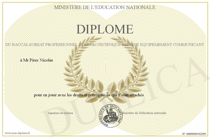 Envoyez par email votre Diplôme du baccalaureat professionnel Electrotechnique Energie Equipemement Communicant personalisé