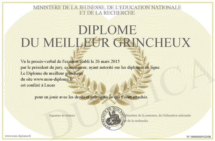 Envoyez par email votre Diplôme du meilleur grincheux personalisé