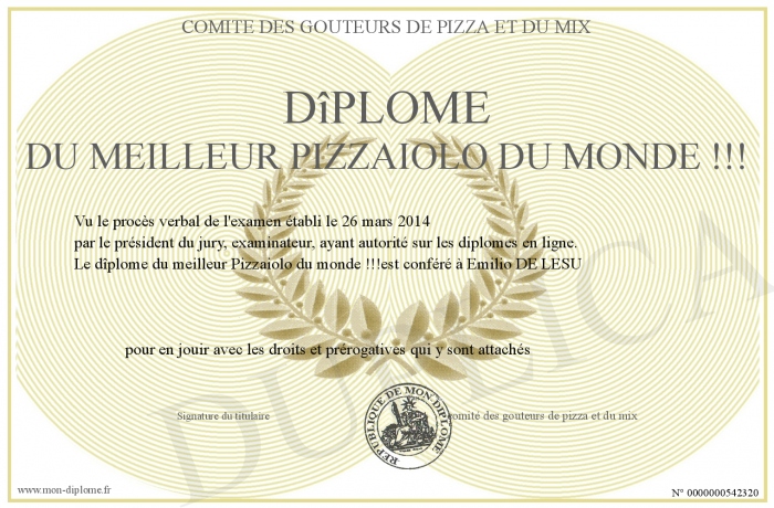 Envoyez par email votre dîplome du meilleur Pizzaiolo du monde !!! personalisé