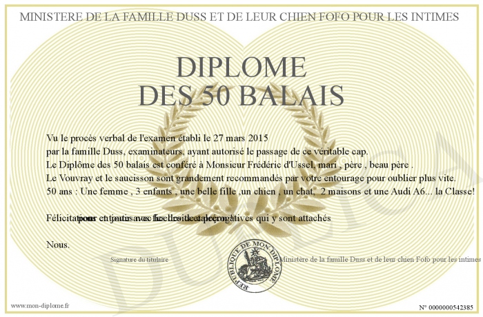 Envoyez par email votre Diplôme des 50 balais personalisé