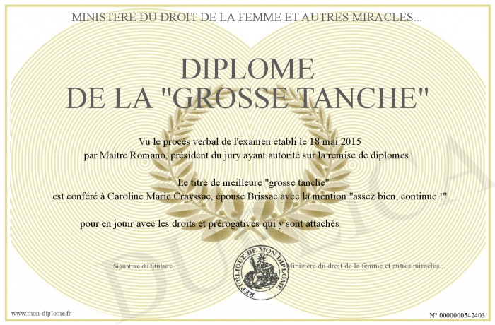 Envoyez par email votre Diplôme de la -grosse tanche- personalisé