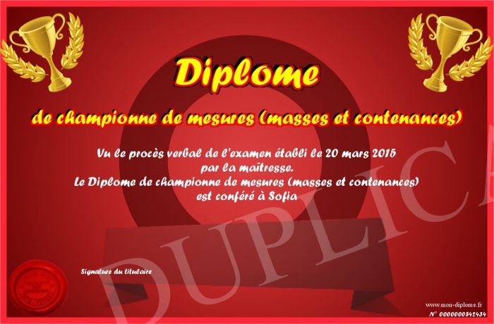 Envoyez par email votre Diplôme de championne de mesures (masses et contenances) personalisé